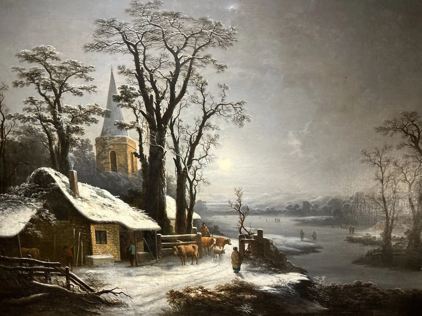 This finely painted oil depicts a tranquil winter scene: figures guiding livestock along a frozen river beside a snow-laden village, with a church tower rising quietly through the trees. The composition is beautifully balanced, with a restrained palette and a subtle handling of light that evokes the calm, contemplative atmosphere characteristic of the Dutch Golden Age.