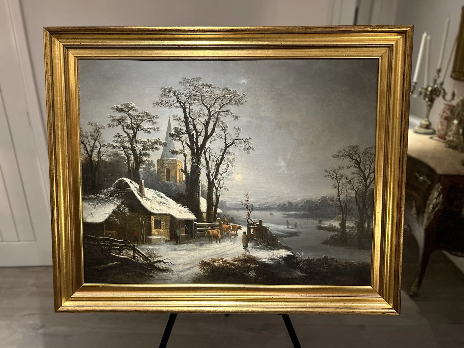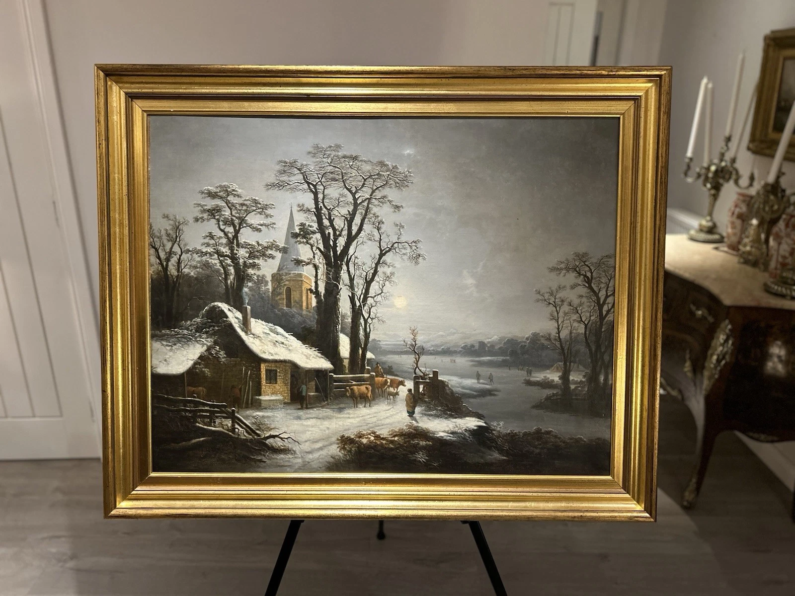 The painting is housed in an elegant gilt frame, well suited to the work and enhancing its overall impact. Together, painting and frame form a refined decorative piece, ideal for a country house, period interior, or classical setting.